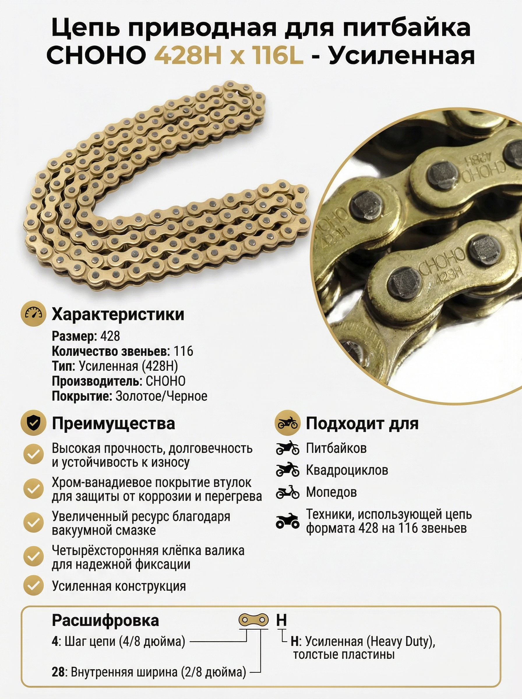 Подходит для питбайков и лёгких мотоциклов как надёжная усиленная приводная цепь с увеличенным сроком службы.